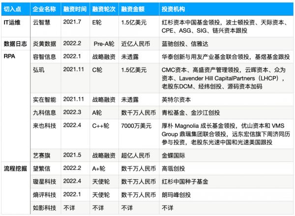 36氪发现,目前国内做流程挖掘的公司分为几类,下游除 RPA 厂商外,还有从IT运维切入的,上游有从日志分析切入的,以及直接做流程挖掘的。