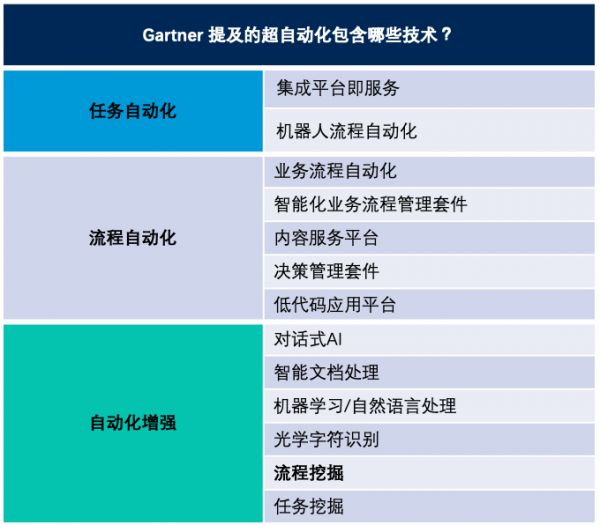Gartner 认为,驱动流程挖掘市场发展的五大因素是数字化转型、人工智能、任务自动化、超自动化和运营弹性, RPA 便属于任务自动化范畴。