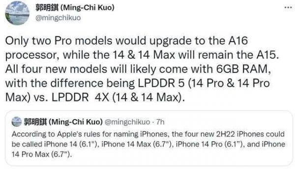 根据目前的爆料来看,iPhone 14/14 Max更多是常规升级,屏幕不支持高刷,也不会升级为A16仿生处理器,而是继续使用A15,早前郭明褀的爆料也称苹果iPhone14及iPhone14 Max还是采用A15处理器。