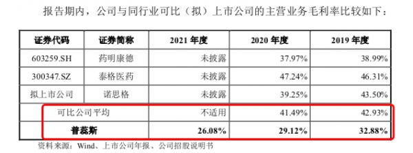 2019年-2021年,普蕊斯的主营业务毛利率分别为 32.88%、29.12%及 26.08%,呈逐年下滑的趋势。