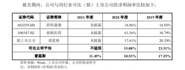 在净利润上,普蕊斯在报告期内的净利润率也低于可比公司均值。