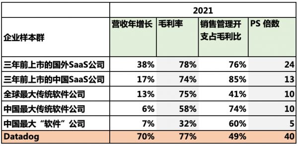 DDOG在上市前的每一轮融资的现金流都达到了年收入的4-6倍,上市那轮更是超过了11倍。反观中国SaaS即便是以1亿ARR,25倍PS去融资,估值10%的现金流也仅是收入的2.5倍。何况25倍PS已经是中国SaaS的天花板,一般能做到10倍已是非常优秀。DDOG的融资现金流达到了年收入的4-6倍,那么他的PS有超过50倍。