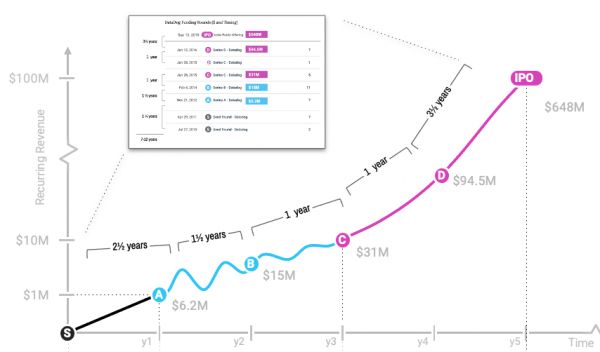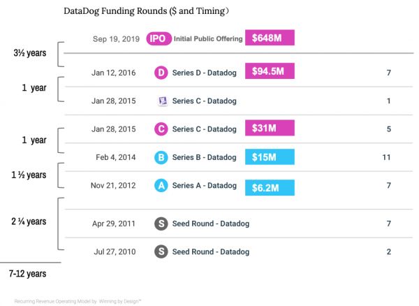 以上是纵向的融资时间线,DDOG花了9年从种子轮跑到IPO上市。