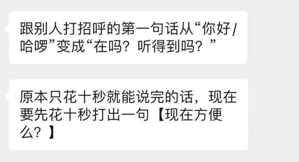 最近我的甲方们居家了,原本一个小需求确认,只要对接人花一分钟去问工位旁边的老板就好,结果现在他要花一分钟想把前因后果打字出来,再花半小时等老板回复,再用十几分钟和同事讨论,最后反馈到我这里一个小时过去了。