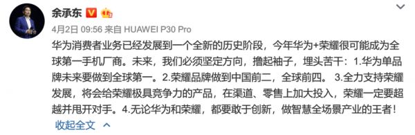 华为的消费者业务,一直都把成为全球第一当作目标。4 月 2 日,华为消费者业务 CEO 余承东在微博表示,华为单品牌要做到全球第一,荣耀要成为中国前二,全球前四。