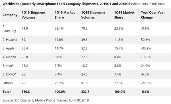 而在全球市场,IDC 发布的 2019 Q1 全球手机厂商出货量数据显示,华为手机销量同比增长 50.3%超越苹果成为全球第二大手机厂商,相较之下,头名三星则同比下跌了 8.1%。