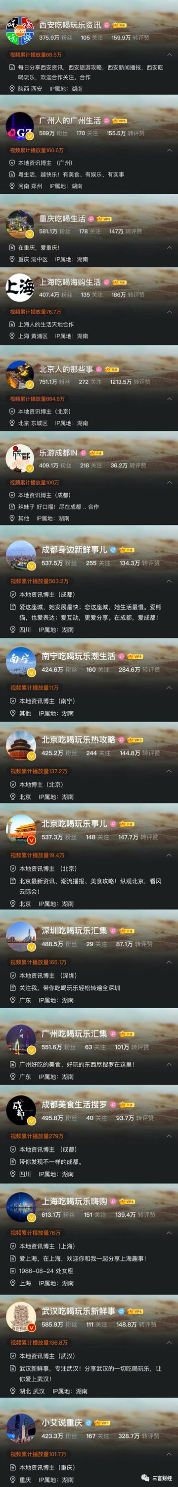 还有“西安吃喝玩乐”、“广州人的广州生活”、“重庆吃喝生活”、“上海吃喝海购生活”等众多全国各地吃喝玩乐类的账号,IP属地均显示为湖南。