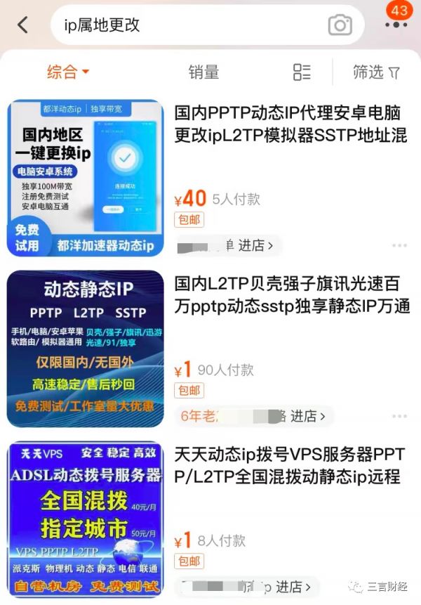 三言财经在某电商平台搜索“IP代理”关键字,发现已经被屏蔽。而搜索“静态IP”、“IP属地更改”、“修改IP”仍可以搜索到很多相关业务。