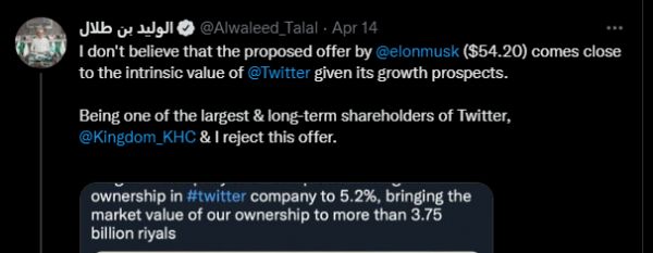 简单前情提要:半个月前马斯克突然发起恶意收购的时候,这位横行全球投资界的沙特王子 Alwaleed Bin Talal,表示自己认为这笔收购“不符合 Twitter 的内在价值”,并且当场拒绝了交易。
