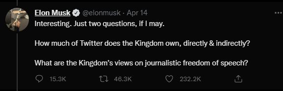 “很高兴和我的’新‘朋友马斯克建立联络,我相信你会成为 Twitter 的优秀领导者,并且实现这家公司潜力的最大化。王室基金和我将会将我们在公司里的 19亿美元投资滚动放入到’新‘Twitter当中,和你一起参与这场令人激动的旅行。”