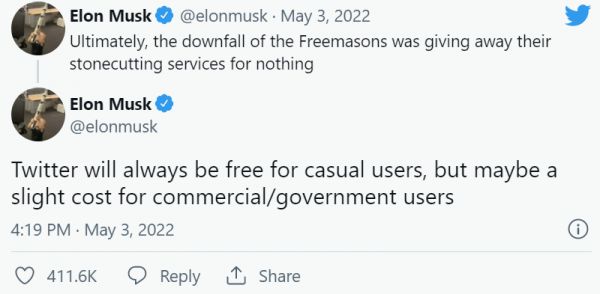 对大公司和政府用户进行收费——这里他用了“共济会衰落的原因就是提供免费服务”作为比喻,来暗讽 Twitter 为政商界提供了免费的宣传工具。