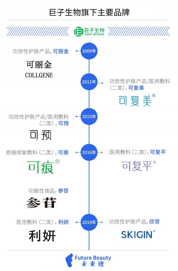 就品牌组合看,巨子生物自诞生以来共推出可复美、可丽金、可预、可痕、可复平、利妍、欣苷(SKIGIN) 以及参苷八大主要品牌,涵盖功效性护肤品、医用敷料和功能性食品。产品组合包括105项SKU和85款在研产品。