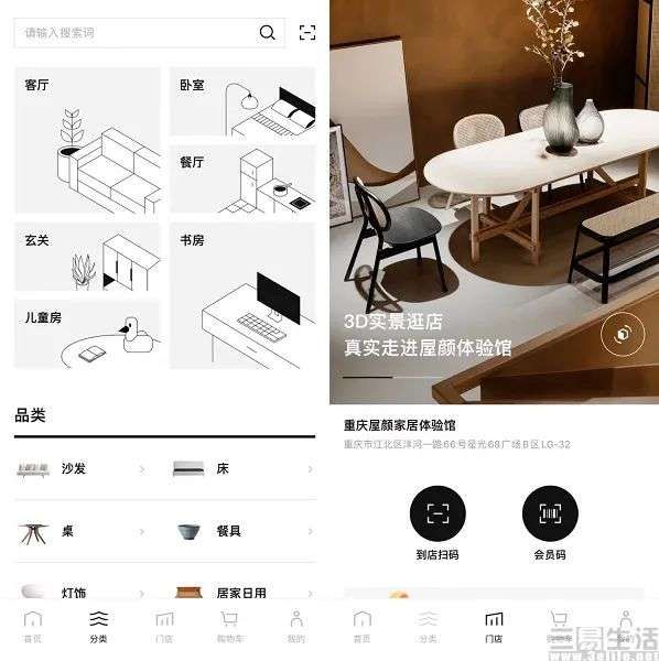 根据我们实际体验来看,“屋颜”的布局类似于宜家APP,提供了客厅、卧室、餐厅、书房、玄关、儿童房等场景主体,每个主题中都有相对应的家居产品。据了解,“屋颜”作为阿里旗下的直营精选家居品牌,目前还设置有线下的家居体验馆,可供用户到店了解商品实物。