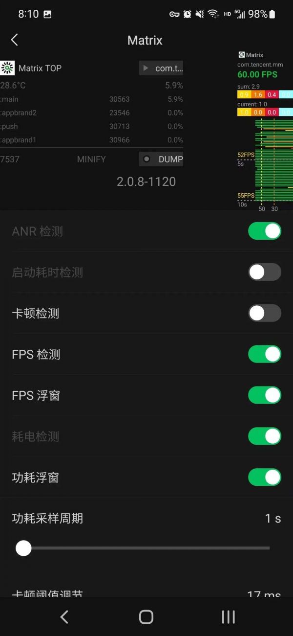 这个Matrix性能检测工具能以屏幕悬浮窗的形式常驻用户显示页面的最上方,提供了占用率,FPS、功耗信息、内存信息等详细的性能数据,甚至还会实时显示当前的核心温度。