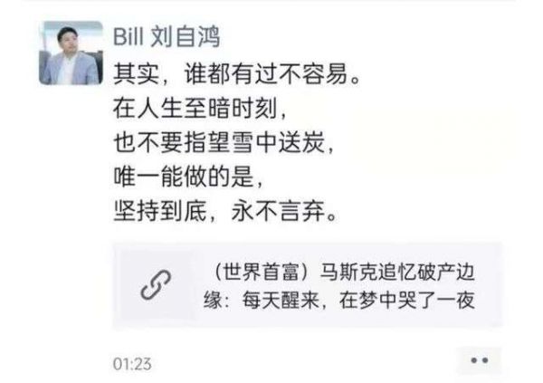 2021年12月9日,刘自鸿在朋友圈转发了一篇文章《马斯克追忆破产边缘》并配文:“其实,谁都有过不容易。在人生至暗时刻,也不要指望雪中送炭,唯一能做的是,坚持到底,永不言弃。”如今,他的朋友圈已设置为三天可见,没有一条状态。
