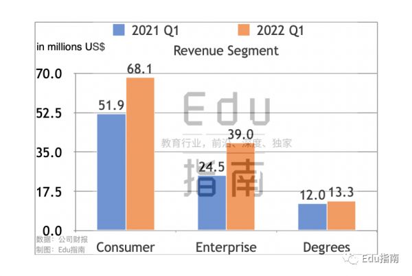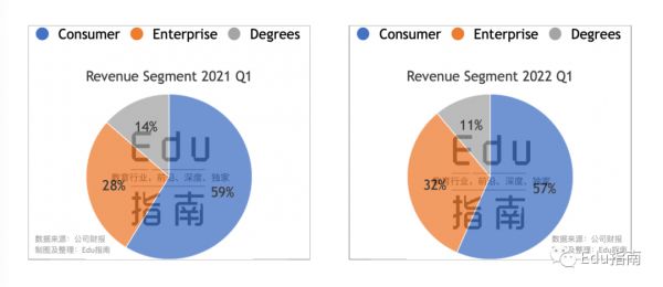 Coursera公司营收主要来自消费者业务(Consumer)、客户业务(Enterprise)以及学位课程(Degrees)业务。三项业务本季度分别贡献营收比例为57%、32%、11%。而去年同期各项占比为59%、28%、14%。可以看到Coursera公司企业客户业务营收占比正在增加,而消费者业务、学位业务营收占比相对减少。