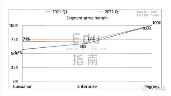 消费者、客户、学位三项业务本季度毛利率分别为71%、72%、100%。去年同期毛利率分别为57%、68%、100%。可以看到本季度消费者、企业客户业务毛利率均在改善。