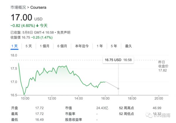 关于 Coursera公司,最早由两位斯坦福计算机科学教授吴恩达 Andrew Ng 和 Daphne Koller 于 2012 年推出,平台引进顶进高校资源,为用户提供世界级学习课程。当前该公司是世界上最大的在线学习平台之一,截至 2022 年 3 月 31 日拥有 1.02 亿注册学习者。 截至当前,Coursera公司市值为24亿美元。