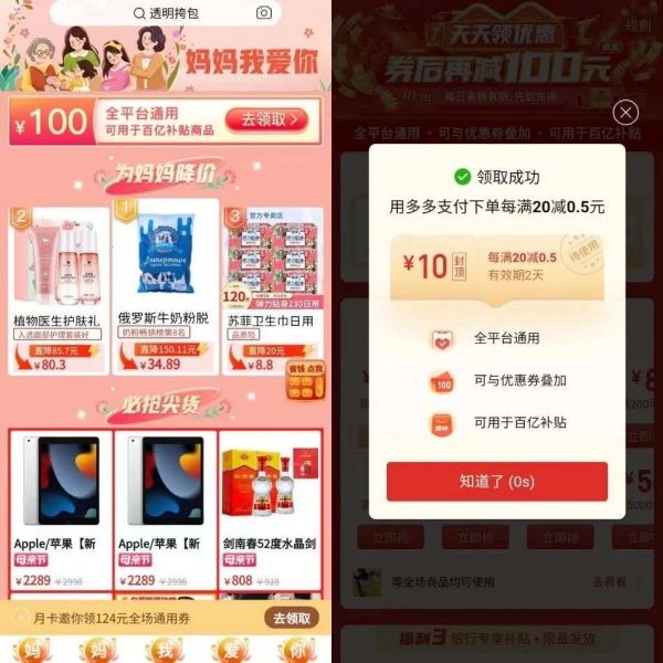 当你点进拼多多的首页,就会看到有一个母亲节的特惠专区;进入专区,就会看到很多商品都有优惠券;点击领券之后,它会告诉你需要你在两天内下单才能使用这个优惠券。优惠券的时间限制,就是一种紧迫感,而有了优惠券,消费者往往也会有更高的几率下单。