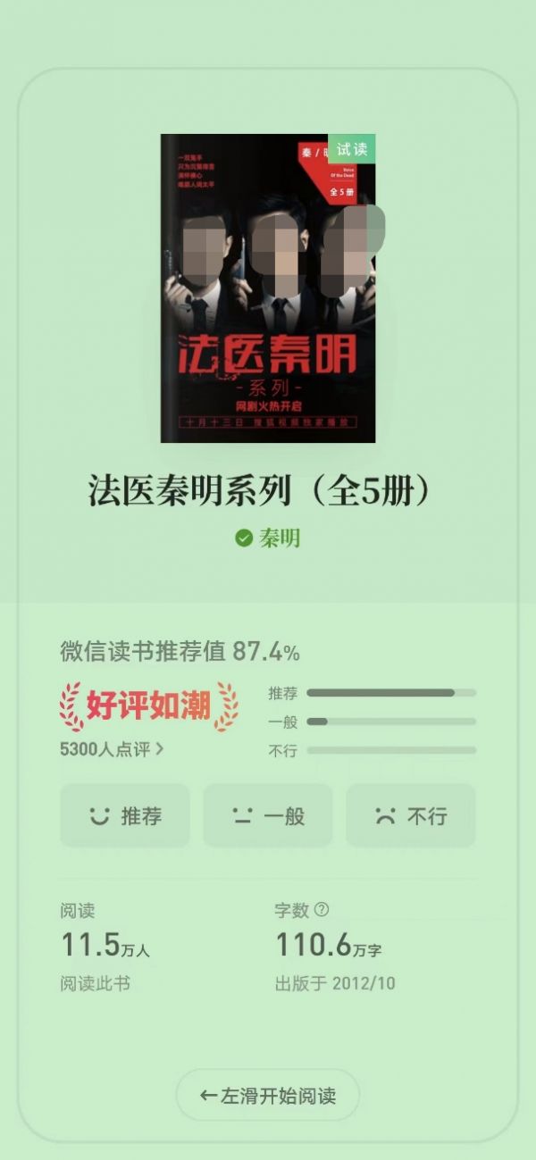 就如《法医秦明系列》这一套书籍,在微信读书APP中共有11.5万人阅读,但它的成本更多的是在引入书籍时的版权费用以及后期APP的运营维护上,内容本身只需要进行一次操作就可以被无数次购买。