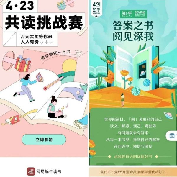 很多短期活动会根据节日、周年等重要日子来举办的,例如在“世界读书日”,各大读书平台举行了大量的短期营销活动:网易蜗牛读书的“4·23共读挑战赛”、知乎的“荐书节”、喜马拉雅“4·23听书节——畅听经典,成就更好的自己”……