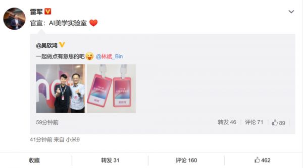 今日下午,小米联合创始人、总裁@林斌在微博公布,小米成立美图AI美学试验室,美图创始人吴欣鸿一同加入,雷军也转发并“官宣”。