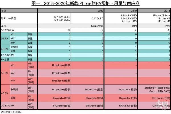 天风国际分析师郭明錤在报告中表示,预期2020年下半年新iPhone产品线将包括高端的6.7英寸与5.4英寸OLED iPhone,与低端的6.1英寸OLED iPhone;6.7英寸与5.4英寸OLED iPhone将支持5G。此外,郭明錤预期2021年下半年新款iPhone将全部支持5G。预测5G iPhone占2020年下半年新iPhone总出货量约60% (市场共识为20%)。郭明錤称,先前选择与高通和解,代表英特尔开发5G基带芯片失败,且2020年下半年新iPhone将支持5G。苹果将在2022年或2023年推出自行设计的5G基带芯片,在这之前,苹果将采用高通的5G基带芯片。