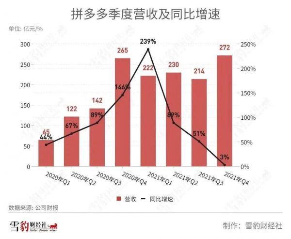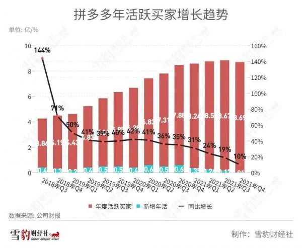 2021年四个季度,拼多多营收分别为222亿、230亿、214亿元、272亿元,增速显著放缓,其中Q1和Q3两个季度环比下降。截至2021年Q4,拼多多年度活跃买家为8.687亿,环比Q3新增140万,远低于Q1的新增3500万。这也是自2018年7月上市以来,拼多多年度活跃买家数增长最少的一个季度。