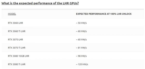 LHR 最初是在 GeForce RTX 3060、3060 Ti、3070 和 3080 的新版本中引入的,后来也在 RTX 3050、3070 Ti、3080 12 GB 和 3080 Ti 上获得应用。据称,在目前版本的GPU上,LHR算法与硬件有较为紧密的集成。