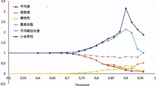 图2 相关系数在各种阈值水平下的网络参数的演变。该图产生了接近0.9的鞍形阈值点,其中网络参数达到其最大值或最小值。