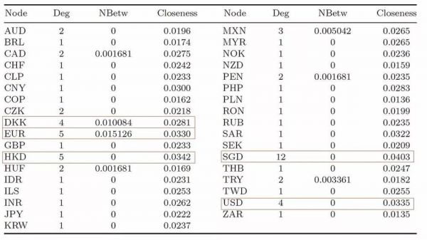 最小生成树上一些节点对于信息,数据等的传播具有重要意义。这些节点(比如战略位置)的拓扑属性使得他们比其他节点更有影响力。这种现象也同样存在于货币网络中。表1中的网络节点属性使我们能够讨论网络中的重要节点。