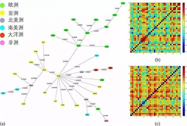 图3 (a)2005年至2017年的货币最小生成树,(b)相关性矩阵的可视化,(c)距离矩阵的可视化。新加坡元位于网络的中心,除节点位置外,其他节点主要受两个因素影响:文化/地理效应和经济关系。