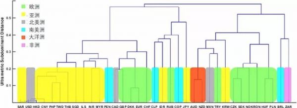 研究人员也再次看到,与其他欧元区国家相比,经济发展较好的欧洲国家形成了一个子集群。其中一个英联邦国家,加拿大元与其他国家分开,并直接与英镑挂钩。此外,我们也可以发现,发展中国家的子集群是分开的,墨西哥比索与土耳其里拉,还有巴西雷亚尔与南非兰特是联系在一起的。