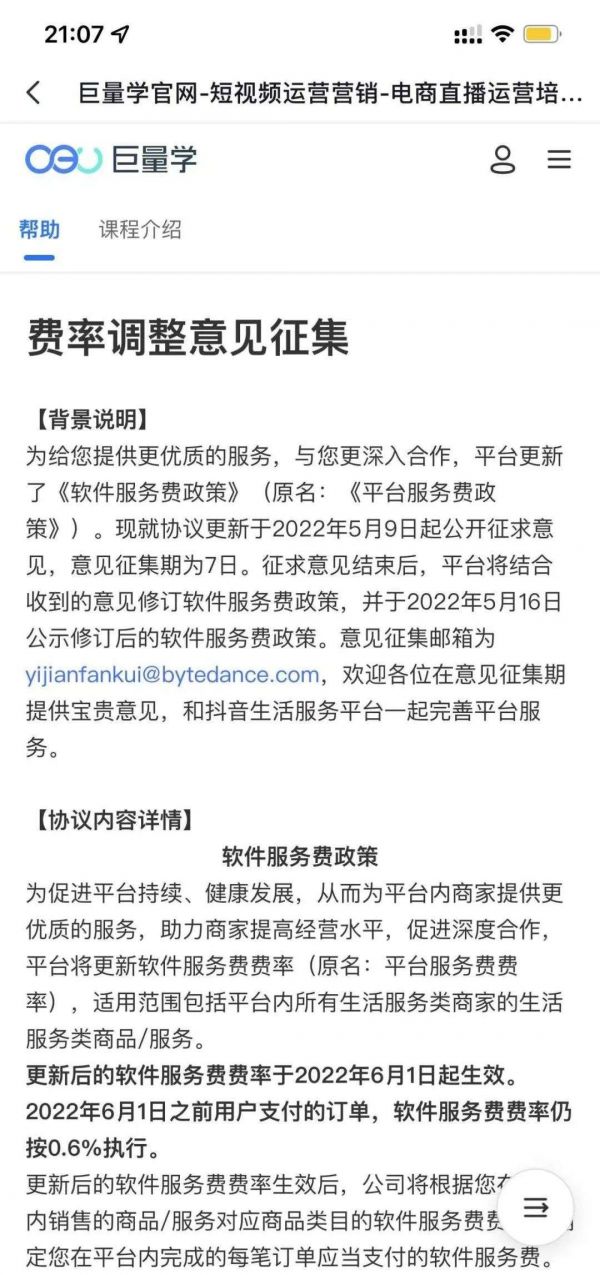 日前,巨量学(字节跳动旗下数字化教育培训平台)官网发布《费率调整意见征集》,指出抖音平台更新了《软件服务费政策》(以下简称《政策》),更新后,住宿、游玩、休闲娱乐等多类生活服务类商家的软件服务费率将会有不同程度的上调。