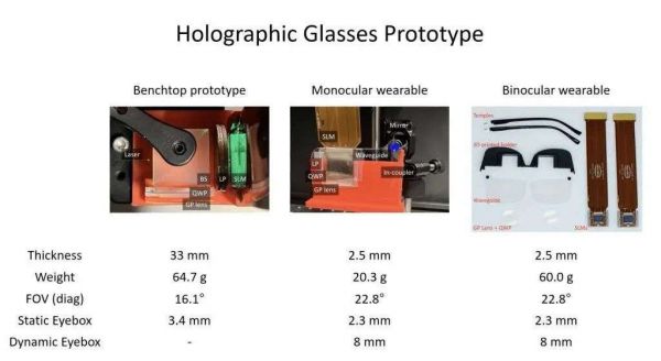 比如这款全息眼镜目前还只是通过大型台式模型和可穿戴原型进行演示,驱动板并不包括在眼镜内,离设想中的轻薄还有距离。对角视场只有 22.8°,还有 2.3 毫米的静态和 8 毫米的动态眼盒,意味着视野也相当有限, 还达不到实用的水平。