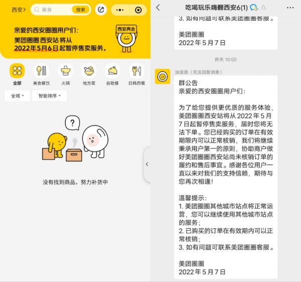 对此,美团方面向《新言财经》表示:“美团圈圈是公司的一个探索型的营销产品,目前还在试点阶段,未来也将根据市场变化在更多地方进行不同的探索。西安站从5月6日起暂停售卖服务,已经购买的订单在有效期限内可以正常核销,我们将继续秉承以客户为中心的原则,协助商户做好美团圈圈西安站尚未核销订单的履约和售后事宜。同时,我们也将不断推进圈圈的优化升级,期待未来以更好的方式继续为西安市民提供服务。”