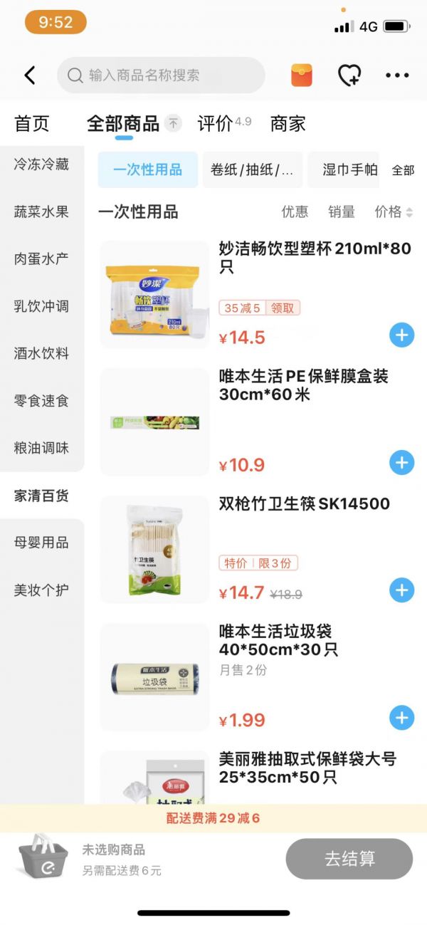 配送费,陆玖财经选择了多种货物组合,均为6元,而且还获得了免运费的优惠。相比之下,京东超市的配送费用会根据重量不同而有所变化,有时候甚至达到12元。