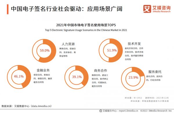 艾媒咨询显示,电子签使用场景的前三个分别是实名认证(50.7%)、审批管理(45.7%)、企业合同管理(43.8%)。电子签名在金融(9.3%)、地产(8.5%)、汽车(3.6%)等大额合同较多的行业逐渐兴起,大中型客户逐渐增多。