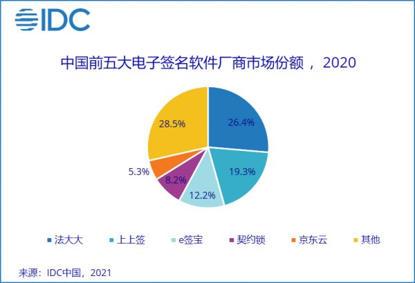 2021年,电子签行业内,法大大、上上签、e签宝三家服务商市场占比近60%,京东、腾讯、字节跳动等互联网巨头也纷纷入局,除参与战投合作之外还亲自进行了产品布局。