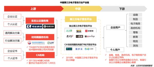国内电子签市场则从1998年开始萌芽,至今已经形成较为完善的产业链:上游包括实名认证服务商、时间戳服务机构、CA机构等,中游包括第三方电子签名平台,下游包括各类终端用户(政府机构、互联网平台、金融机构等)以及消费者个人用户。