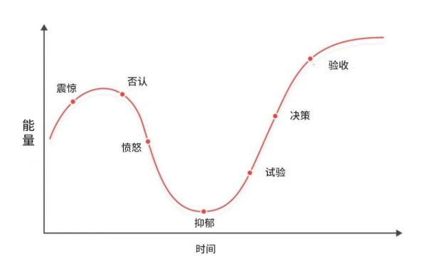 “变化曲线”(change curve)的原型是上世纪60年代心理学家伊丽莎白·库布勒罗斯(Elisabeth Kübler-Ross)提出的悲伤阶段模型。这个心理学模型概括了大多数人在面对变化、损失或其他意外事件时的情绪反应。分别对应从知道变化(震惊、否认)到感受最初的负面影响(沮丧、抑郁),再到处理变化(实验),最后将变化融入新的现实(决定、接纳)的经历过程。