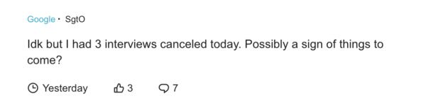 一些正在频繁面试寻求跳槽机会的科技公司员工也在Blind上表示:“我今天已经有三个被取消的面试了。也许这意味着将要发生什么。"
