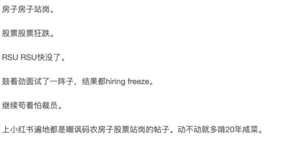 也有网友表示最近房子站岗,股票狂跌,RSU没了,鼓着劲面试结果还招聘冷冻了。总结一句话,就是芭比Q了。