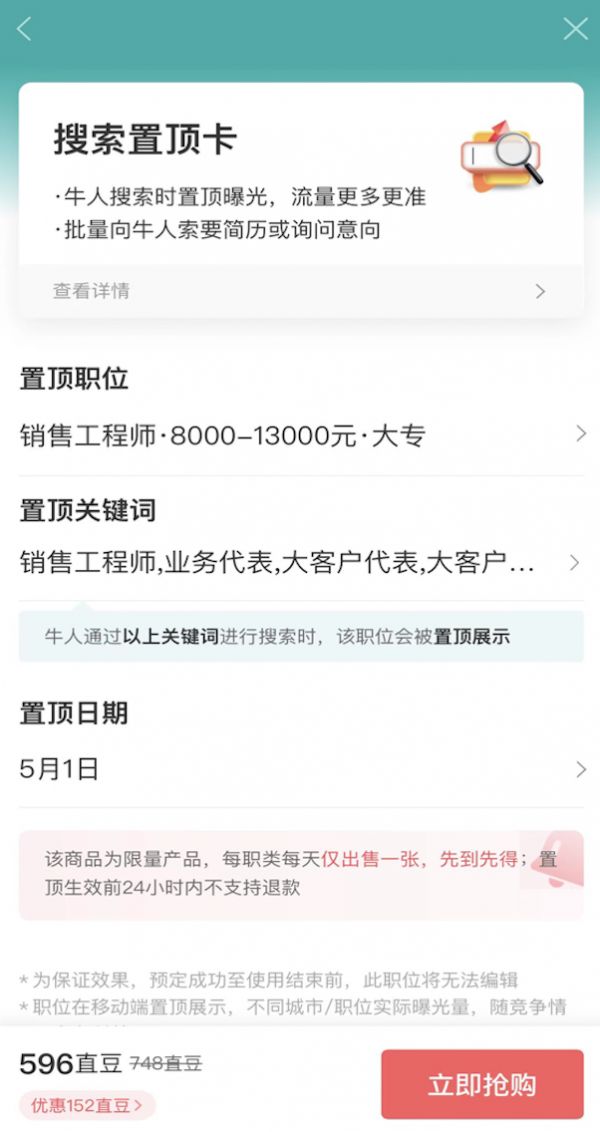 ▲ 图:BOSS直聘搜索置顶卡购买页面
