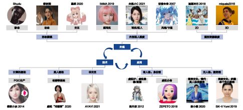 虚拟偶像是虚拟数字人的重要类别,也是主要的变现方式之一。1982 年,以手绘技术作支撑的世界第一位虚拟歌姬林明美诞生,虚拟人首次被引入现实世界,其发布的音乐专辑取得骄人的成绩,证明了虚拟人利用高质量内容变现的商业模式的可行性。随后职业偶像始终作为虚拟偶像发展主流,海外及中国均不断推出歌唱类或唱跳类虚拟偶像,包括以初音未来为代表的日本虚拟歌姬,和以洛天依为代表的中国虚拟偶像,走出了较为成功的商业变现之路。2016年以后,虚拟角色兴起,虚拟主播、虚拟 KOL、虚拟品牌形象频频出世,在直播、电商、品牌营销等细分场景参演。