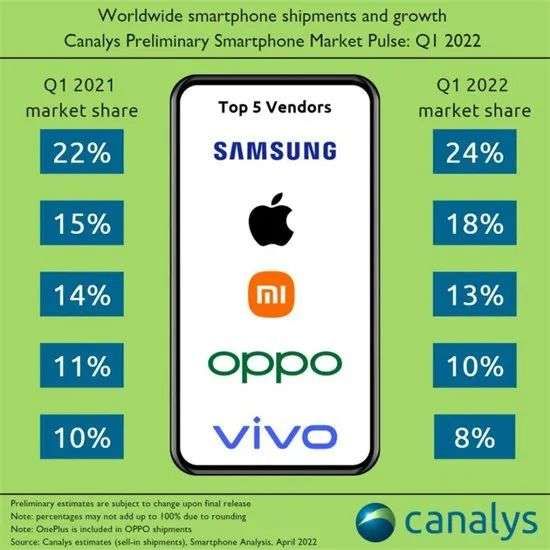 从市场份额来看,根据Canalys发布的2022年第一季度全球智能手机市场报告显示,三星和苹果分别以24%和18%的市场份额,位列全球手机出货量第一和第二,小米、Ov占据前五名剩余三个席位。华为如今已经在排行榜上彻底不见踪影,被归类为“Others”一列。