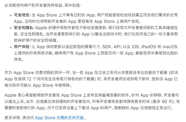 4月29日,苹果在开发者网站正式发布公告,对于在过去三年内从未更新且未达到最低下载量的APP,苹果会以电子邮件的方式告知开发者其APP已被识别并可能从苹果App Store中移除。开发者需要在限期内及时更新他们的APP,限期时长从之前引起热议的30天延长至90天。
