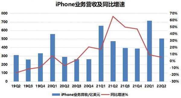 近期苹果发布的2022年Q2财报显示,iPhone 单季营收为505.70亿美元,相比去年同期的497.38亿美元,营收增速下降到了5.5%。