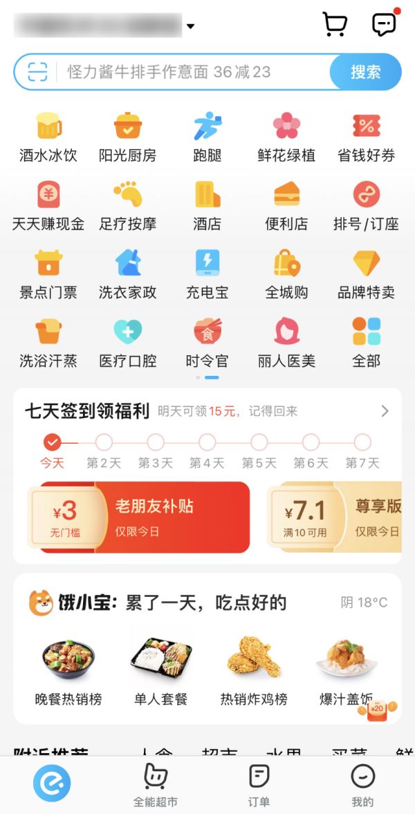 举个例子,如果不加提示,相信许多人是看不出来这是“饿了么”APP的主页。也许相比让用户更方便地点外卖,展示自己的“无所不能”会更有成就感。