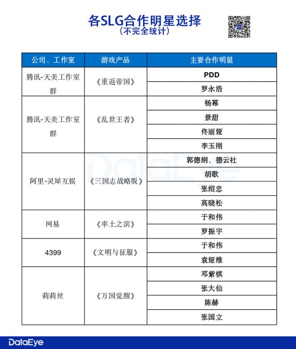 80后玩家是SLG游戏的核心用户,他们普遍有着较多的社会阅历,基于这一点,SLG在品牌侧的宣发,多以邀请明星代言的方式进行传播。